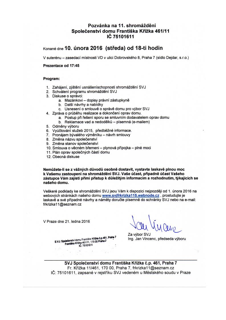dne 10.2.2016 se bude konat 11. shromáždění vlastníků Společenství domu Františka Křížka č.p. 461, Praha 7.